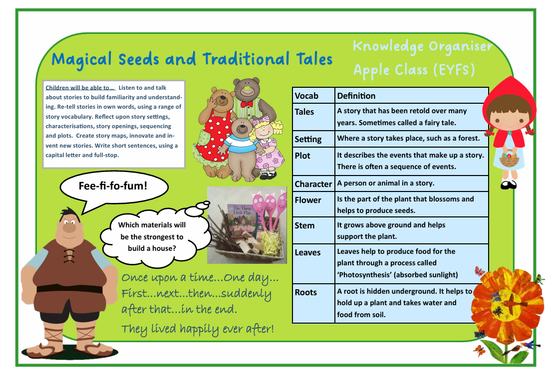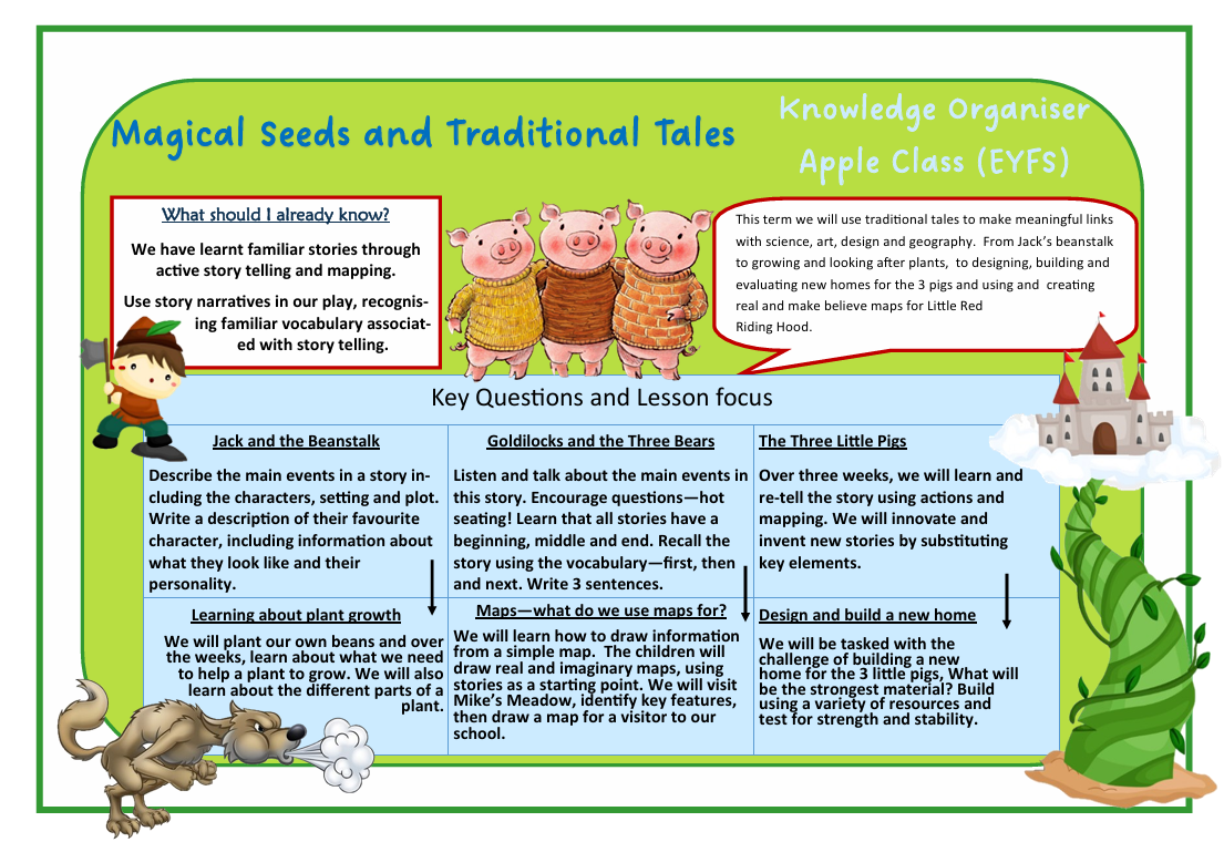 This term, we are stepping into the magical world of traditional tales—where beanstalks reach the clouds, brave little pigs design their own homes, and a girl in a red cloak travels through both real and imagined forests. Through the joy of storytelling, we will explore meaningful links across the curriculum. From investigating how Jack’s beanstalk might grow in real life and learning how to care for plants, to designing, building and evaluating new homes fit for the Three Little Pigs, our stories will spark curiosity and creativity. We’ll also journey with Little Red Riding Hood as we use and create both real and make-believe maps, discovering the wonderful connections between tales, science, art, design, and geography. This storytelling adventure promises to nurture imagination while deepening understanding across our learning.